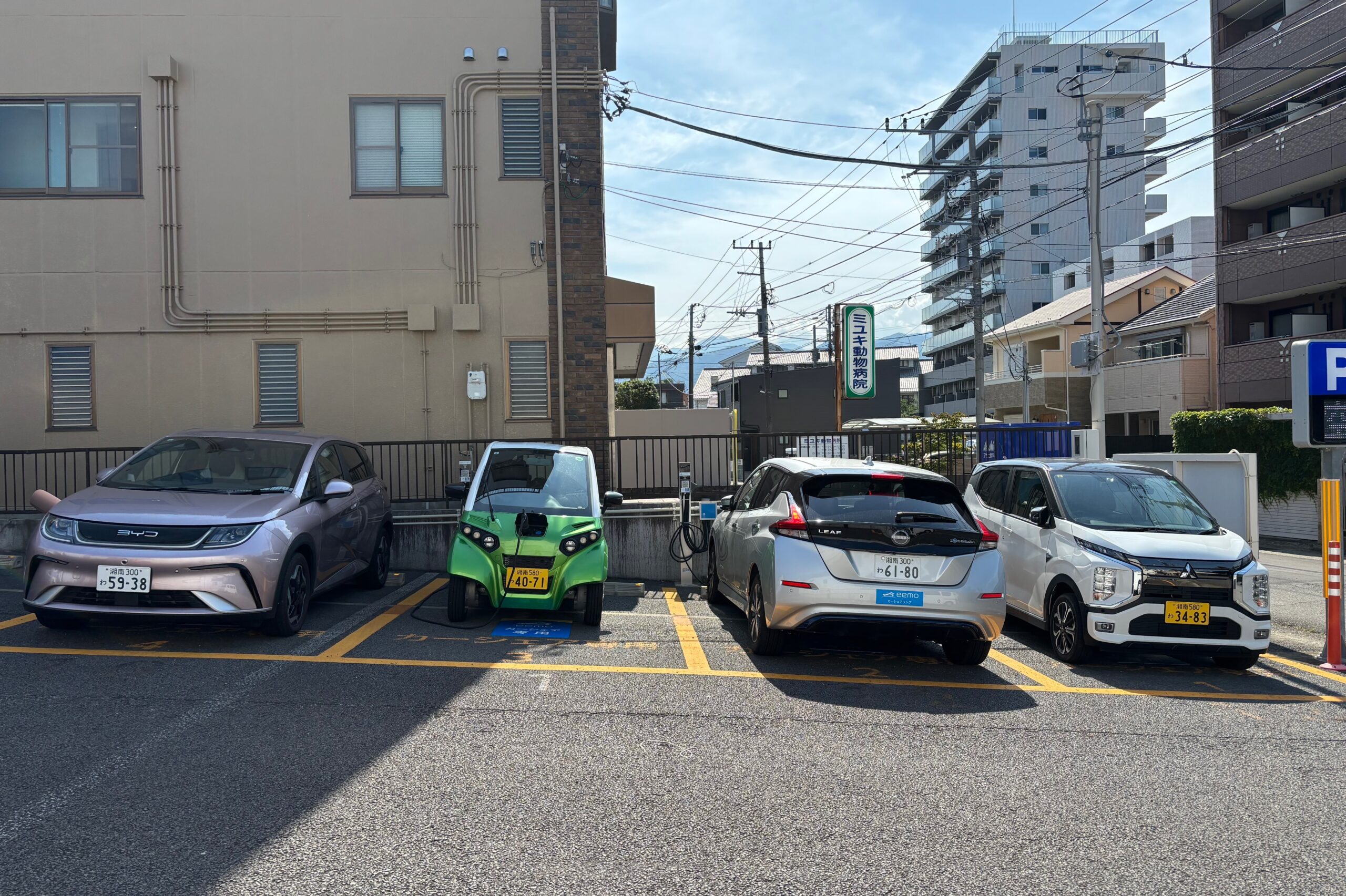 三菱ekクロスEV:1台、FOMM ONE:1台、日産リーフ:1台、BYD DOLPHIN:1台