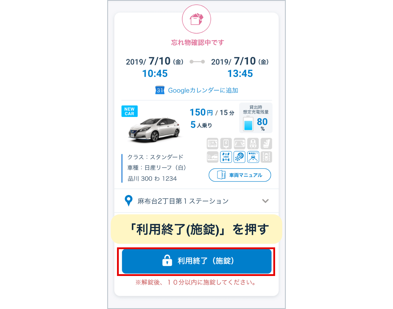 利用時の走行距離の予想と予約時に走行可能な距離が表示されます。